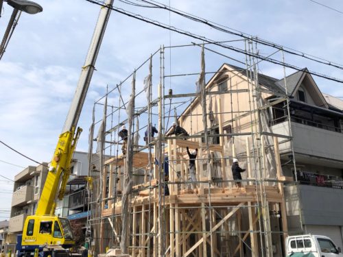 本日、M様邸が無事に上棟しました! 木造3階建てのお家。 5人の大工さんの息はピッ…