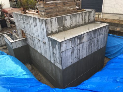 木造2階建てと、ガレージ部分は鉄筋コンクリート造の混構造。 外部の型枠をばらし、GLから下部を防…