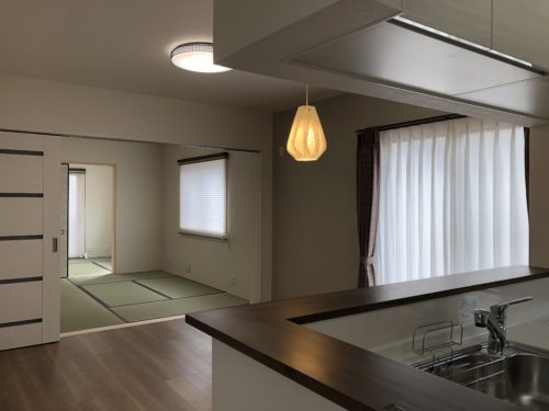 LDKの三枚引き戸を開けると、大人数が集える大きな部屋になります。
