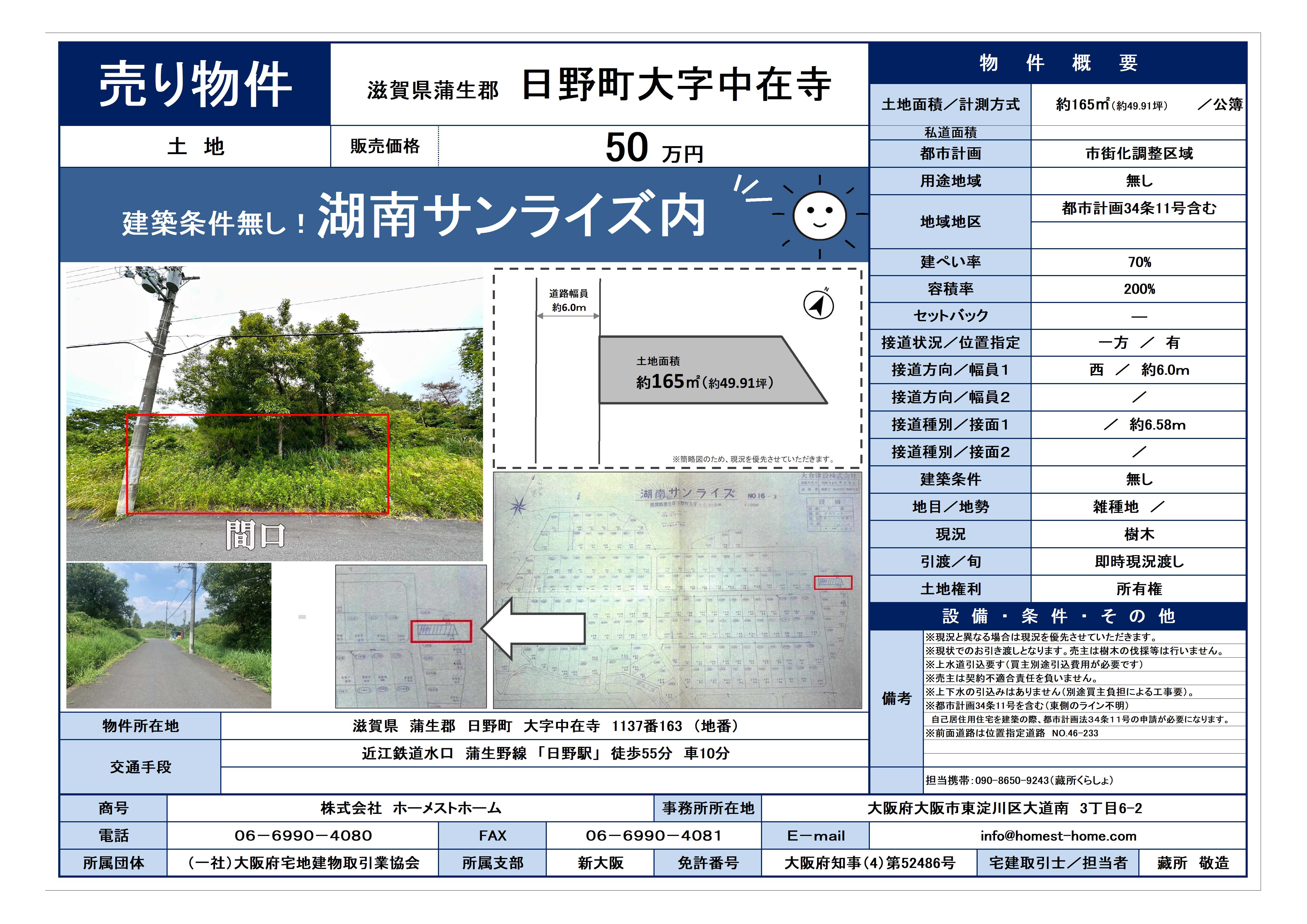 都市計画:市街化区域/用途地域:第二種中高層住居専用地域/地域地区:-/建ぺい率:60%/容積率:200%(道路幅員につき約184%/接道:一方/接道方向:西/幅員:約4.6m/接道種別:公道/接面:約12.0m/地目:宅地/地勢:- /現況:古家付き(空き家)/引き渡し:相談/土地権利:所有権
