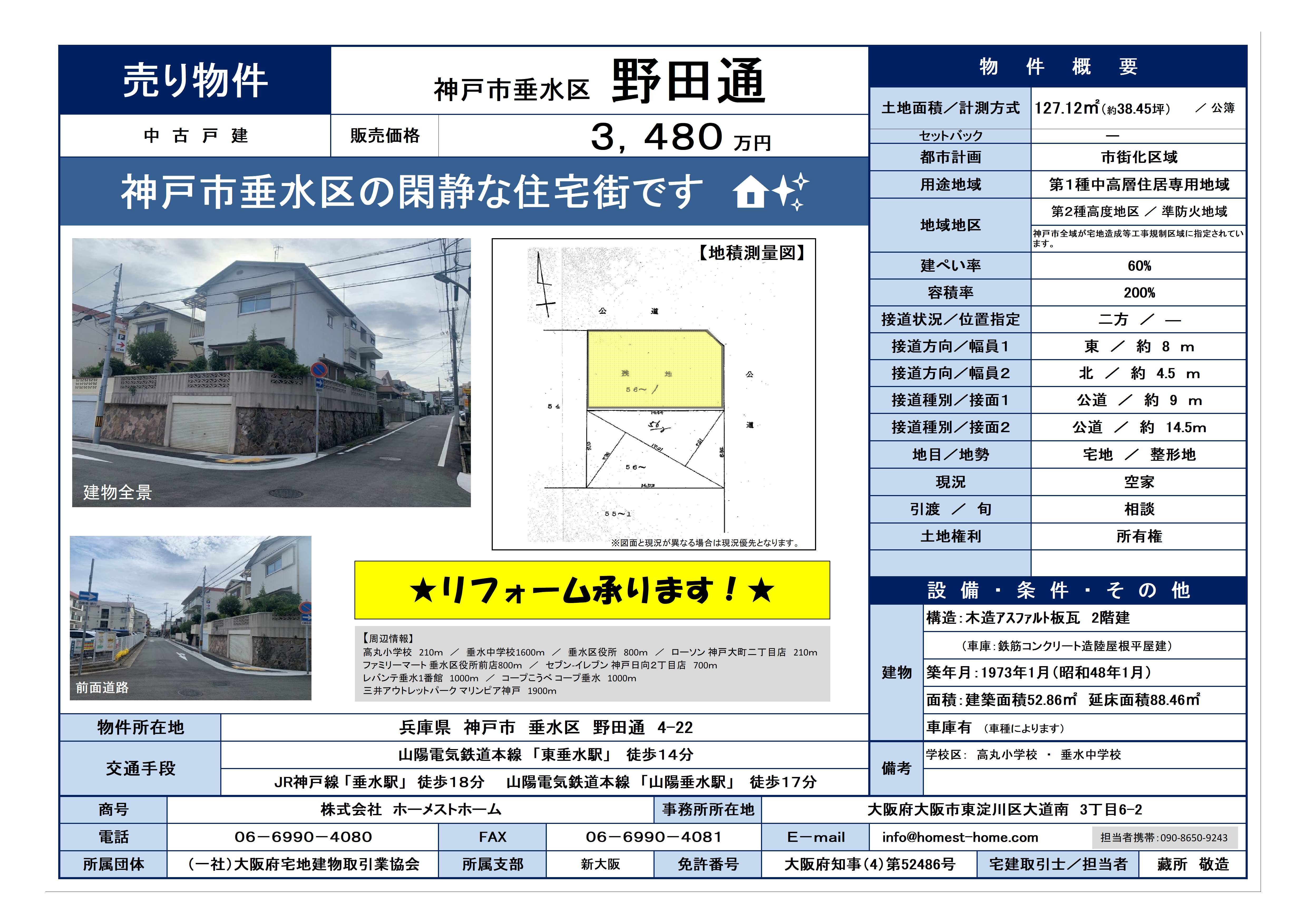 都市計画:市街化区域/用途地域:第一種中高層住居専用地域/地域地区:第二種高度地区、準防火地域(神戸市全域が宅地造成工事規制区域に指定されています)/建ぺい率:60%/容積率:200%/接道:二方/接道方向1:東/幅員1:約8m/接道種別1:公道/接面1:約9m/接道方向2:北/幅員2:約4.5m/接道種別2:公道/接面2:約14.5m/地目:宅地/地勢:整形地 /現況:古家付き(空き家)/引き渡し:相談/土地権利:所有権